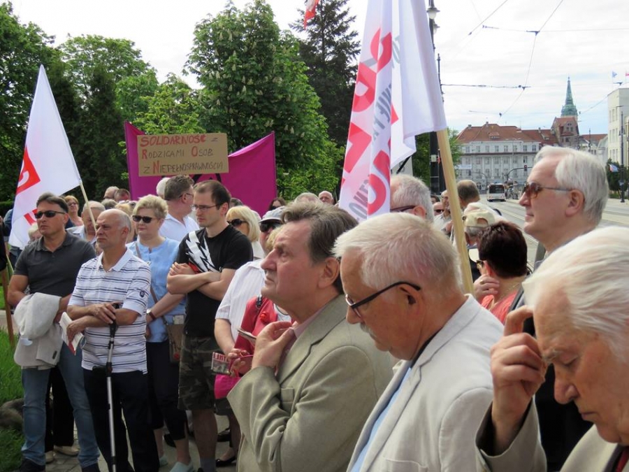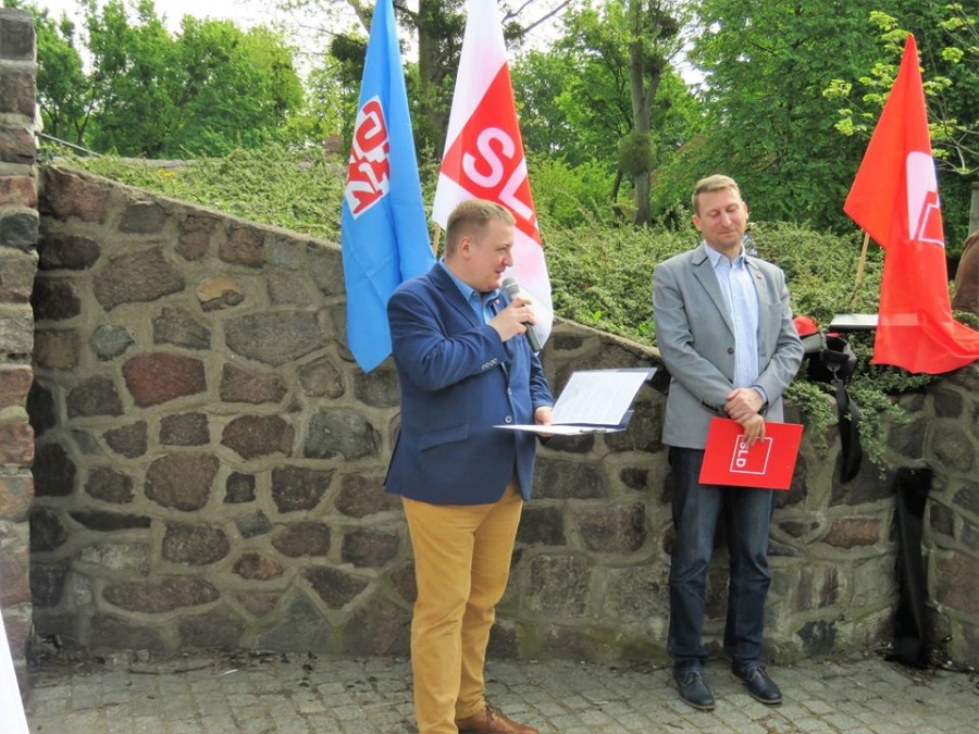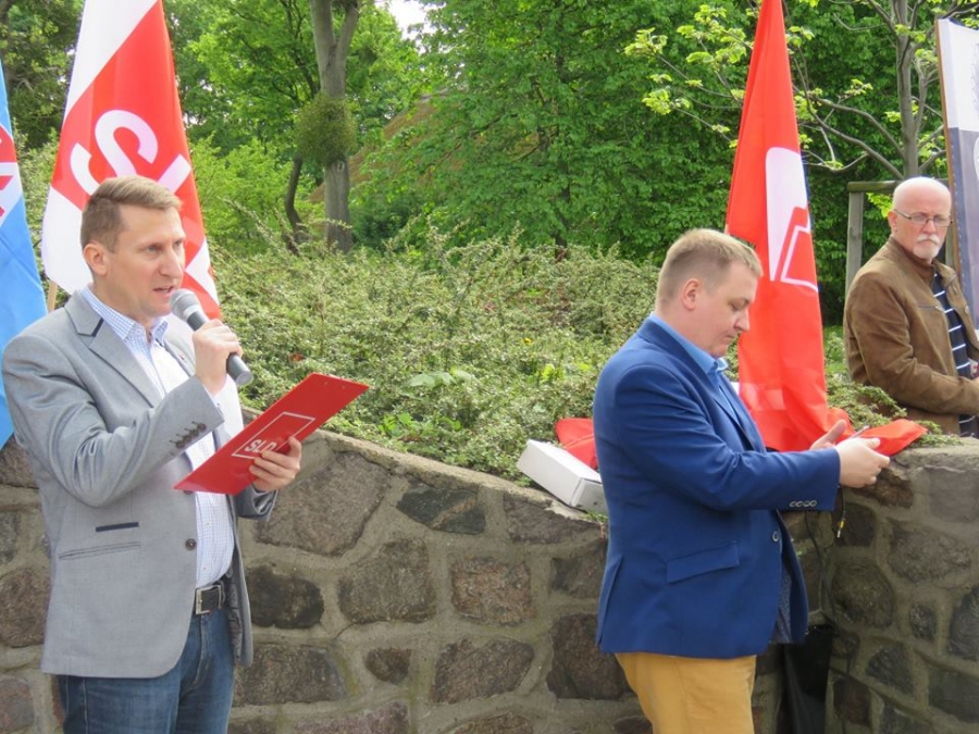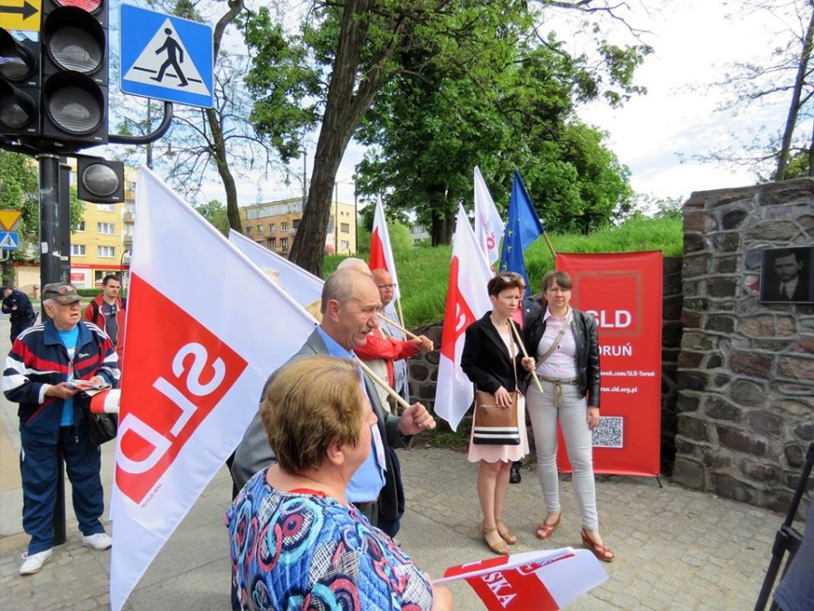 Tradycyjnie z okazji Święta Pracy w Toruniu odbył się dzisiaj okolicznościowy wiec. W miejscu gdzie do niedawna wisiała tablica upamiętniająca Juliana Nowickiego zebrani wysłuchali okolicznościowych przemówień. Podkreślano w nich głównie obecną sytuację, w której znaleźli się emerytowani funkcjonariusze służb mundurowych oraz nauczyciele po reformie oświaty. Poruszano także kwestie praw kobiet i godnego funkcjonowania osób niepełnosprawnych oraz ich rodzin. Na zakończenie podkreślono wartości, którymi kieruje się dzisiejsza lewica, a które to są zbieżne z tymi, będącymi fundamentem zjednoczonej Europy. Dziękujemy wszystkim za przybycie. Członkom i sympatykom SLD, przedstawicielom służb mundurowych i wojska, delegacji ZNP oraz środowisk broniących praw kobiet. Przede wszystkim jednak, dziękujemy przybyłym mieszkańcom Torunia, którzy mimo dzielących nas różnic przybyli by wspólnie domagać się poszanowania godności, praw pracowniczych i praw człowieka z prawami kobiet i osób niepełnosprawnych w szczególności. Dziękujemy, w imieniu organizatorów - szef SLD w Toruniu i powiecie toruńskom Marek Jopp. Zdjęcia - Dawid Podlewski.